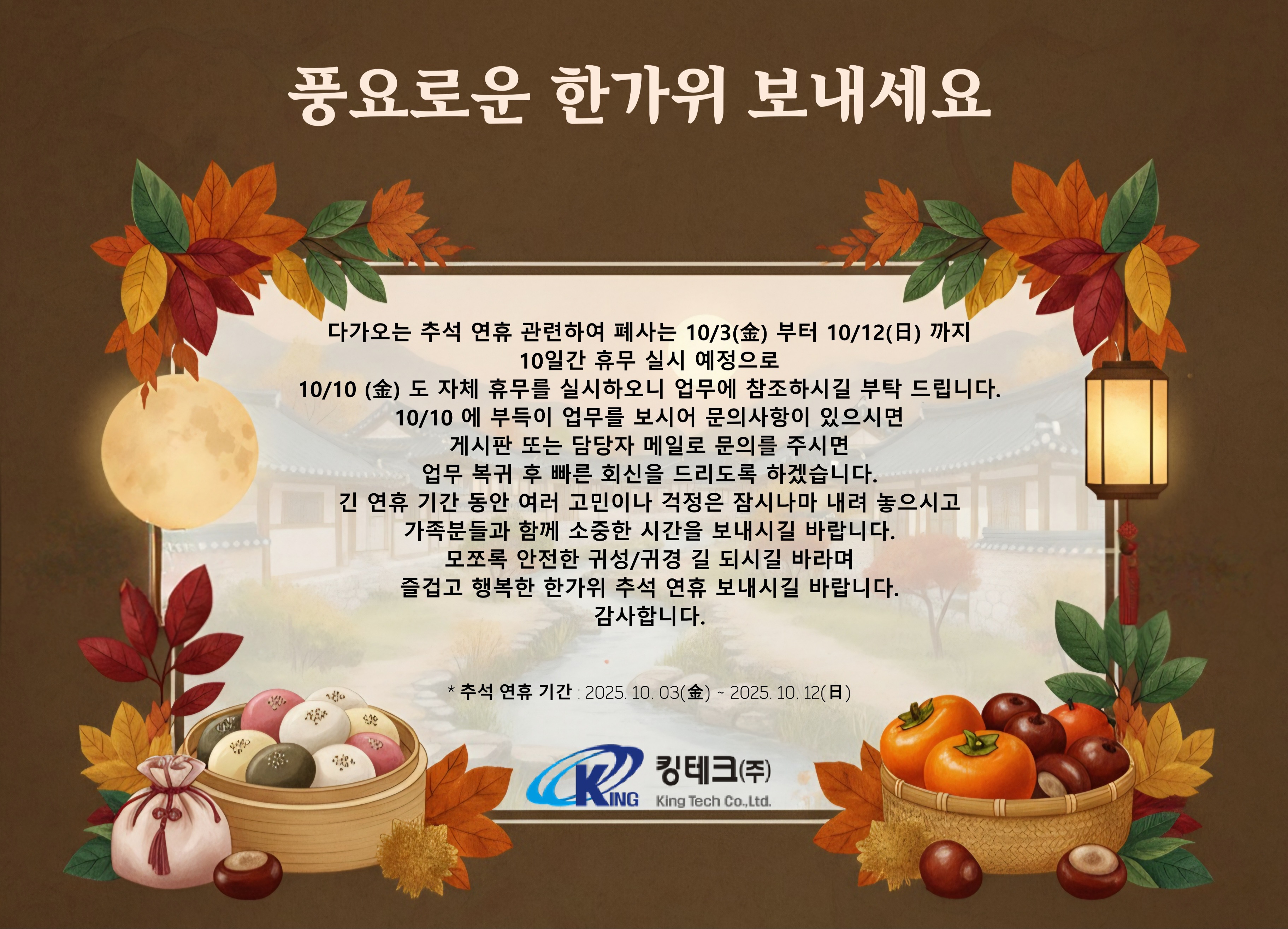 * 추석 연휴 기간 : 2025. 10. 03(金) ~ 2025. 10. 12(日)